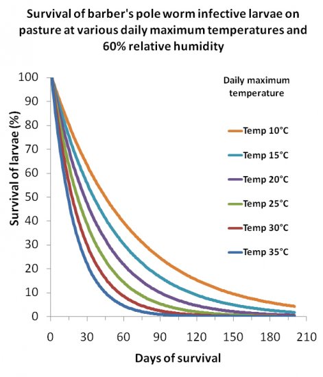 Source: Modeled from death rate of the L3 population in ‘Simulation of pasture larval populations of Haemonchus contortus’ by IA Barger, PR Benyon & WH Southcott. Proceedings of the Australian Society of Animal Production (1972) 9: 38
