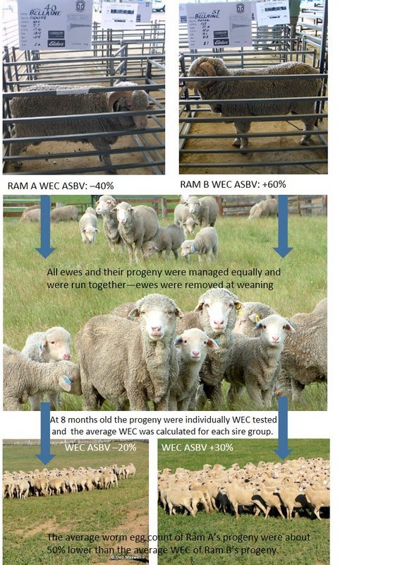 In simple terms, Ram A is likely to have 100% less worm eggs himself at any time than Ram B if they were managed and run together. As only half of his genes are passed on, only half (on average) of the additional level of resistance is passed on; in this case, 50%.