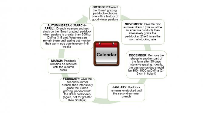 'Smart grazing' combines intensive grazing for 30 days with each of the 2 'summer' drenches to ensure that virtually no worm eggs are deposited on a chosen pasture from the first summer drench (November) until after the autumn break (March–April), when the weaners are put into these pastures.